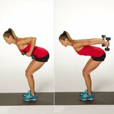 - Упражнение для ног и ягодичных мышц. Делаем в положении стоя, вначале ставим ноги на уровень плеч, руки опускаем вниз. Выполняем приседания, держа в руках гантели. Приседание выполняем таким образом, чтобы линия бедер была параллельна с уровнем пола. При выполнении спину строго держим прямо. Количество сетов от трех до четырех по 20 повторений.